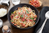 Spaghetti z sosem pomidorowym, parmezanem i serem mozzarella ozdobione bazylią.
