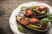 Karniyarik - Bakłażany nadziewane, bakłażany z mielonym mięsem i warzywami pieczone z sosem pomidorowym serwowane na talerzu.