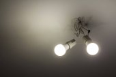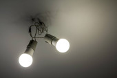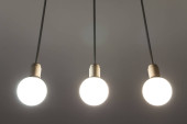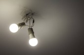 Jasne okrągłe proste lampy świecące na szorstkiej zielonej tynkowanej ścianie na zewnątrz, kopiowanie tła przestrzeni.