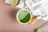 Zdjęcie "Matcha zielonej herbaty latte z mlekiem kokosowym. Widok z góry." może być wykorzystywane do celów osobistych i komercyjnych zgodnie z warunkami zakupionej licencji Royalty-free. Obraz jest dostępny do pobrania w jakości wysokiej rozdzielczości do 5760x3840.