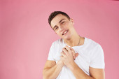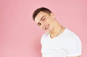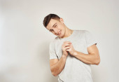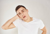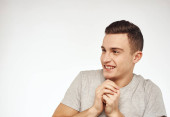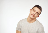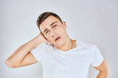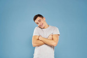 przystojny mężczyzna w lekki t-shirt przycięty widok emocje studio odizolowane tło