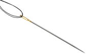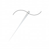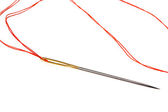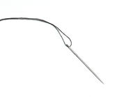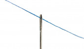 Stalowa błyszcząca igła do szycia z niebieską nitką w oku izolat zbliżeniowy na białym tle