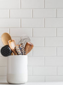 Zdjęcie "Stylowy biały tło kuchnia z naczynia kuchenne w ceramicznym słoiku na białym blat, kopia miejsca na tekst, widok z przodu" może być wykorzystywane do celów osobistych i komercyjnych zgodnie z warunkami zakupionej licencji Royalty-free. Obraz jest dostępny do pobrania w jakości wysokiej rozdzielczości do 5760x3840.