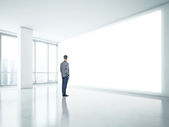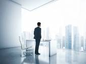 biznesmen stoi puste biuro jasny i spojrzeć na miasto