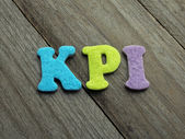 Pojęcie słowo 'KPI - kluczowy wskaźnik perfomancji' na drewnianych kręgach między stronami książki na pięknym drewnianym stole. Białe tło. Koncepcja biznesowa, przestrzeń do kopiowania.