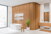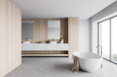 Zdjęcie "Wnętrze nowoczesnej łazienki z białymi i drewnianymi ścianami, betonową podłogą, wygodną wanną i podwójnym zlewem. 3d renderowanie" może być wykorzystywane do celów osobistych i komercyjnych zgodnie z warunkami zakupionej licencji Royalty-free. Obraz jest dostępny do pobrania w jakości wysokiej rozdzielczości do 5760x3840.