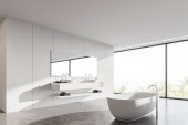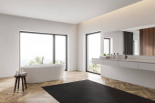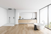 Zdjęcie "Narożnik stylowej łazienki z białymi i drewnianymi ścianami, betonową podłogą, wygodną wanną i podwójnym zlewem. 3d renderowanie" może być wykorzystywane do celów osobistych i komercyjnych zgodnie z warunkami zakupionej licencji Royalty-free. Obraz jest dostępny do pobrania w jakości wysokiej rozdzielczości do 5760x3840.