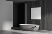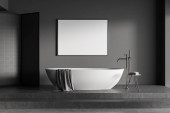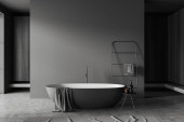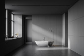 Zdjęcie "Wnętrze stylowej łazienki z szarymi ścianami, betonową podłogą, wygodną wanną i kabiną prysznicową. 3d renderowanie" może być wykorzystywane do celów osobistych i komercyjnych zgodnie z warunkami zakupionej licencji Royalty-free. Obraz jest dostępny do pobrania w jakości wysokiej rozdzielczości do 5760x3840.