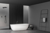 Wnętrze stylowej łazienki z szarymi ścianami, betonową podłogą, wygodną wanną i kabiną prysznicową. 3d renderowanie