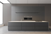 Wnętrze nowoczesnej kuchni z jasnoszarymi ścianami, betonową podłogą i drewnianym barem ze stołkami. 3d renderowanie