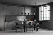 Wnętrze stylowej kuchni z szarymi ścianami, betonowa podłoga, szare szafki, bar i stół z krzesłami. 3d renderowanie