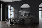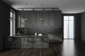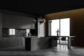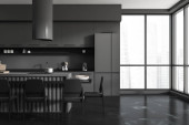 Zdjęcie "Wnętrze stylowej kuchni z szarymi ścianami, betonowa podłoga, szare szafki, bar i stół z krzesłami. 3d renderowanie" może być wykorzystywane do celów osobistych i komercyjnych zgodnie z warunkami zakupionej licencji Royalty-free. Obraz jest dostępny do pobrania w jakości wysokiej rozdzielczości do 5760x3840.
