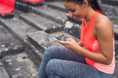 Strzał na świeżym powietrzu młodej sportowca siedzącej na ławce i patrzącej na smartfona, odpoczywającej po treningu