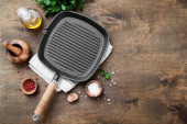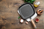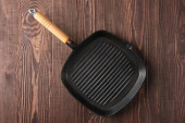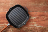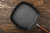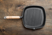 Pusty żeliwny grill patelnia na drewnianym tle, widok z góry