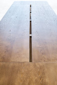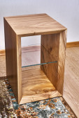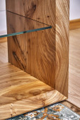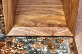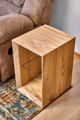 Żywe krawędzi wiązu płyta sofa boczna stół w nowoczesnym salonie. Nowoczesne meble z bliska