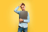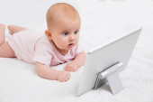 Zdjęcie "Szczęśliwe dziecko leży na łóżku i trzyma się laptopa rękami. Koncepcja rozrywki i edukacji dla dzieci korzystających z Internetu." może być wykorzystywane do celów osobistych i komercyjnych zgodnie z warunkami zakupionej licencji Royalty-free. Obraz jest dostępny do pobrania w jakości wysokiej rozdzielczości do 5760x3840.