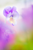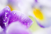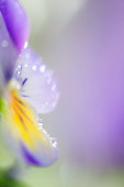 Krople deszczu na kwiatach fioletowych (Viola sp.) płatki. Skupienie selektywne i płytka głębia ostrości.