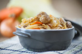 Smażona wieprzowina z brzoskwiniami, nerkowcem i zieloną fasolą w drewnianej misce na szarym, betonowym tle. Widok z boku, zbliżenie, kuchnia chińska.