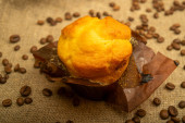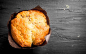 Klasyczne bananowe babeczki z czarnym papierem na drewnianym stole