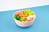 Zdjęcie "Nad głową zdjęcie poke bowl, tradycyjnej hawajskiej i Japanise surowej sałatki rybnej, z wodorostów morskich, ryżu, łososia, ogórka, kiełbasy sojowej i awokado. z pałeczkami i sezamem. Przestrzeń kopiowania, na ciemnym tle płaski leżak" może być wykorzystywane do celów osobistych i komercyjnych zgodnie z warunkami zakupionej licencji Royalty-free. Obraz jest dostępny do pobrania w jakości wysokiej rozdzielczości do 5760x3840.