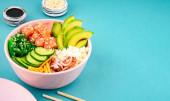 Nad głową zdjęcie poke bowl, tradycyjnej hawajskiej i Japanise surowej sałatki rybnej, z wodorostów morskich, ryżu, łososia, ogórka, kiełbasy sojowej i awokado. z pałeczkami i sezamem. Przestrzeń kopiowania, na ciemnym tle płaski leżak
