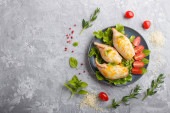 Gotowane krewetki lub krewetki i małe ośmiornice z ziołami na niebieskiej ceramicznej płytce na szarym tle betonu i niebieskim tekstyliów. Widok boczny, przestrzeń kopiowania.