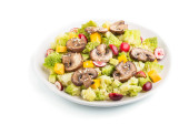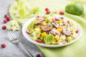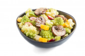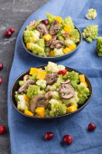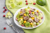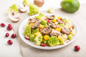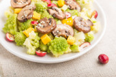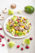Sałatka wegetariańska z kapusty romanesco, champignons, żurawina, awokado i dynia na białym drewnianym tle i tkaniny lniane. widok z boku, zbliżenie, ostrość selektywna.
