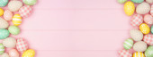 Kolorowa ramka z kolorowymi cukierkami na niebieskim tle. Świąteczna trzcina, czekoladowe jajka, karmelowe dragi. Przestrzeń kopiowania okręgu, widok z góry, układanie płaskie.