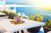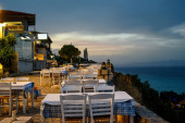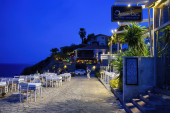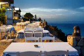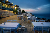 Puste restauracje z tarasem na ulicy w Afytos, Grecja