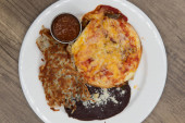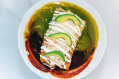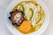 Trzy kolorowe mokre burrito serwowane w czerwonym i zielonym sosie, wygląd i smaki atrakcyjne.