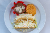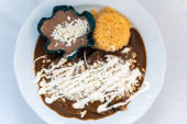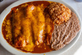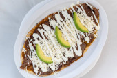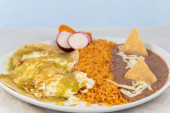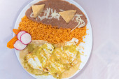 Widok na trzy kolorowe mokre burrito serwowane w czerwonym i zielonym sosie, wygląd i smaki atrakcyjne.