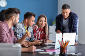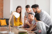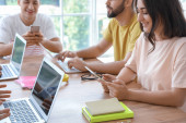 Studenci z nowoczesnymi urządzeniami studiujący online w pomieszczeniach