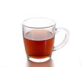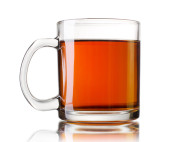 przezroczysty kubek z czarną herbatą na białym tle. przestrzeń kopiowania.