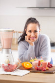 Uśmiechnięta dziewczyna trzyma nóż w kuchni otoczony świeżymi owocami i ziołami.