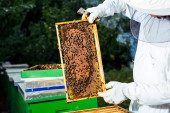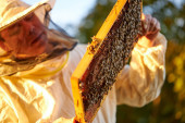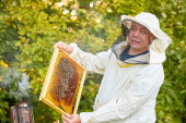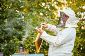 pewny siebie pszczelarz na pasiece w mundurze, kombinezon ochronny