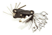 Wielofunkcyjne narzędzie rowerowe z kluczami i śrubokrętami.