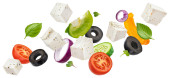 Sałatka warzywna, składniki kuchni śródziemnomorskiej, sałatka grecka na niebieskim tle
