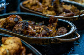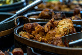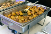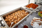 pieczone uda kurczaka w rozgrzewającym garnku na stole gastronomicznym