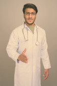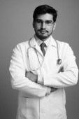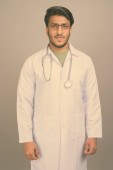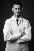 Portret szczęśliwego młodego, przystojnego lekarza perskiego uśmiechającego się z skrzyżowanymi ramionami