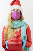 młoda kobieta w czapce Mikołaja i masce medycznej gospodarstwa obecny Boże Narodzenie i kieliszek szampana na czerwono