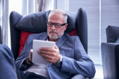 Brodaty starszy pan pije herbatę podczas pracy na laptopie