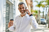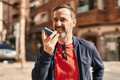 Zdjęcie "Średniowieczny siwowłosy mężczyzna mówi na smartfonie opierając się na ścianie w mieście." może być wykorzystywane do celów osobistych i komercyjnych zgodnie z warunkami zakupionej licencji Royalty-free. Obraz jest dostępny do pobrania w jakości wysokiej rozdzielczości do 5760x3840.