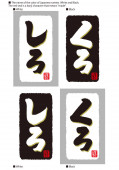Kaligrafia nazw kolorów sosów i składników. Hiragana po japońsku. Lewe litery, znaczenie pisma pionowego. "Biały". Odpowiednie litery, znaczenie pisma pionowego "Czarny".
