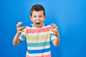 Zdjęcie "Urocze, kaukaskie dziecko ubrane w luźne ubrania, siedzące na stole, wściekłe i wściekłe, podnoszące pięści, sfrustrowane i wściekłe, krzyczące ze złości. wściekłość i agresywne pojęcie. " może być wykorzystywane do celów osobistych i komercyjnych zgodnie z warunkami zakupionej licencji Royalty-free. Obraz jest dostępny do pobrania w jakości wysokiej rozdzielczości do 5760x3840.