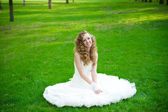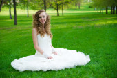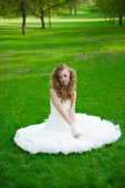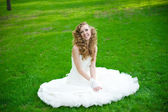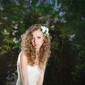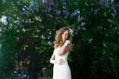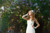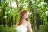 pięknej narzeczonej w białej sukni w kwitnący ogród na wiosnę
