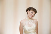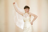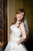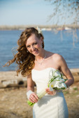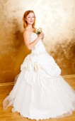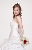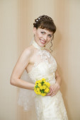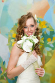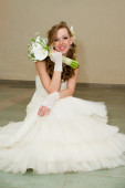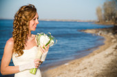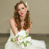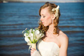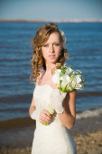 pięknej narzeczonej w białej sukni z bukiet lilii calla