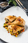 Zdjęcie "Pieczone kacze udka z figami i brzoskwiniami. Białe tło. Widok z góry." może być wykorzystywane do celów osobistych i komercyjnych zgodnie z warunkami zakupionej licencji Royalty-free. Obraz jest dostępny do pobrania w jakości wysokiej rozdzielczości do 5760x3840.