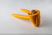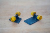 Szpilki do ubrań, zaciski stolarskie koloru pomarańczowego leżą na drewnianym stole