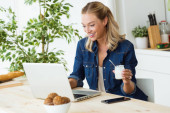 Zdjęcie "Strzał piękny piękny pies całuje jej uśmiechnięty właściciel podczas pracy z laptopem w kuchni w domu." może być wykorzystywane do celów osobistych i komercyjnych zgodnie z warunkami zakupionej licencji Royalty-free. Obraz jest dostępny do pobrania w jakości wysokiej rozdzielczości do 5760x3840.