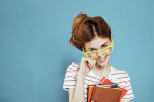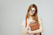 studentka z notatnikami na różowym tle, gestykulująca ręcznymi okularami na modelce koszulki w paski